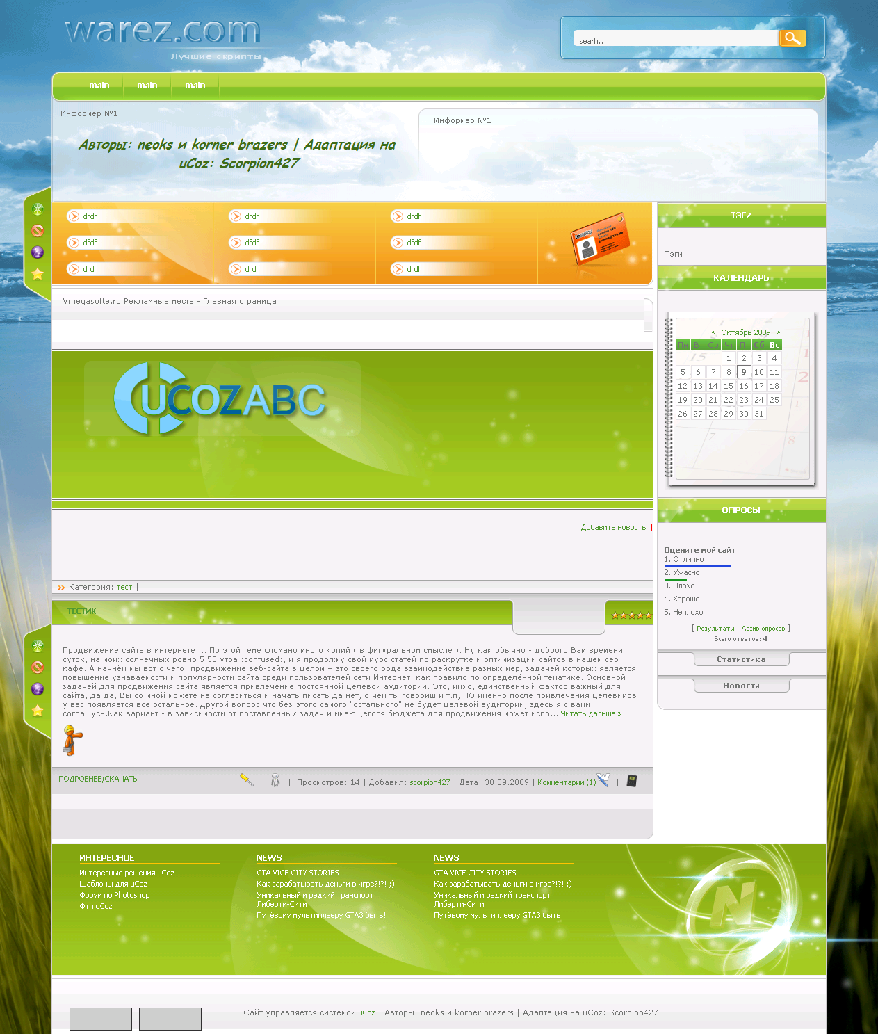 | Название шаблона: neoks warez ver.2.5 В браузерах: во всех кроме IE6 Комплектация: TPL, CSS, JS, Тип шаблона: Оригинал Сайт автора: prowebber.ru Сайт адаптации: http://ucozabc.ru/ Авторы: neoks и korner brazers Команда: runet team Адаптация на uCoz: Scorpion427